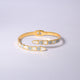 At the heart of this luxurious bracelet lies a captivating green stone, its rich and vibrant hue reminiscent of lush emerald landscapes. This striking gemstone is elegantly set within the design, creating a stunning focal point that draws the eye and enhances the overall aesthetic of the piece. The deep green of the stone provides a beautiful contrast against the warm golden tones of the bracelet, resulting in a harmonious blend of materials that is both visually appealing and sophisticated.